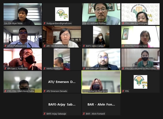 QUEZON CITY, January 5, 2022 – To kickstart the Balanced Fertilizer Strategy (BFS) Program, the Fertilizer and Pesticide Authority (FPA) initiated its very first meeting via Zoom application. Representing FPA were Executive Director Wilfredo Roldan; Deputy Executive Director for Fertilizer Dr. Myer Mula; Ms. Anjaneth Palcutilo; Fertilizer Regulations Division (FRD) Chief Ms. Julieta Lansangan; Supervising Agriculturist Rowena Reyes; Senior Agriculturists Maribel Querijero and Marlo Deblois; Agriculturist II Jesson Garcia; and Agriculturist I Mark Kevin Salita. The other member agencies were represented as follows: Dr. Rosana Mula, Director (ATI), Ms. Joeve Calleja (BAFS), Mr. Samuel Fontanilla and Mr. John Leo Gamboa (BPI), Prof. Patrick Rocamora (UPLB), Engr. Arjay Sabasaje (BAFE), and Mr. Alvin Fontanil (BAR).