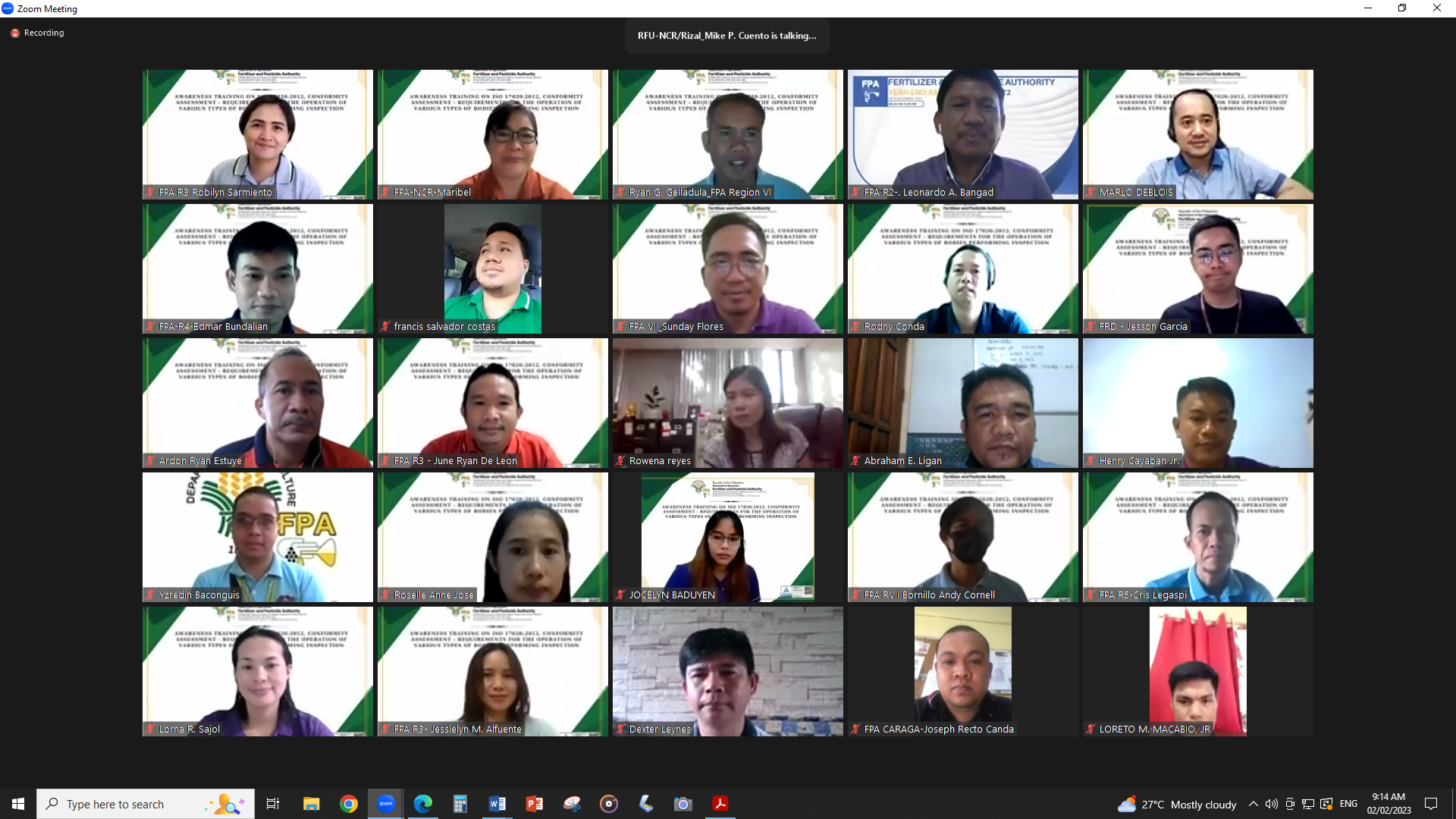 Quezon City | February 10, 2023 – To introduce and explain the international standard on conformity assessment in relation to the monitoring and enforcement function of Regional Field Units, the FPA Regional Field Unit NCR conducted an Awareness Webinar on ISO/IEC 17020:2012 held on February 2, 2023 via zoom.